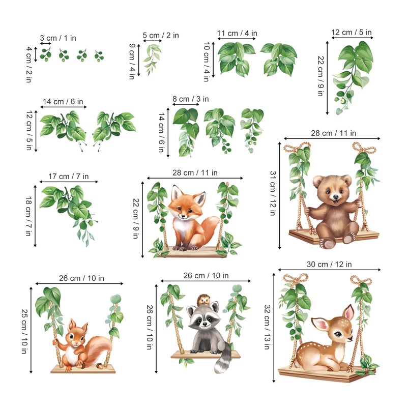 wondever Woodland Animal on Swings Wall Stickers Baby Bear Deer Fox Leaves Pe...