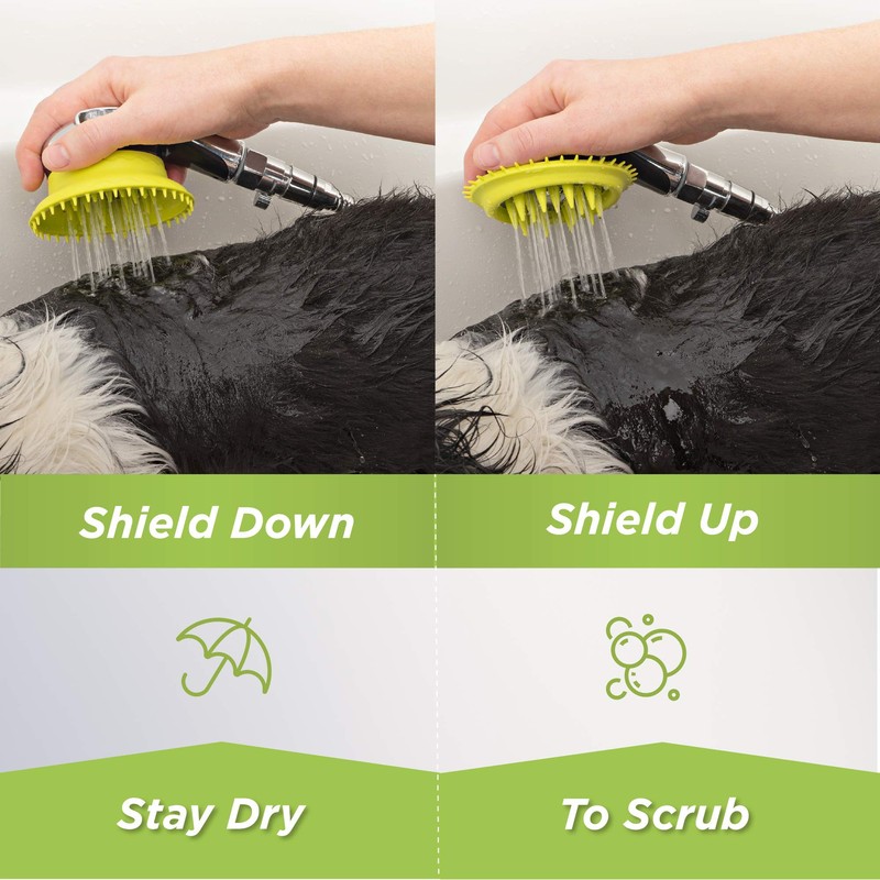 - INNOVATIVE BRUSH DESIGN: No more getting soaked! Our patented rubber splash shield and bath hose attachment will keep you dry as you groom and massage your dog. It's the ultimate choice in grooming comfort for both you and your pet.
