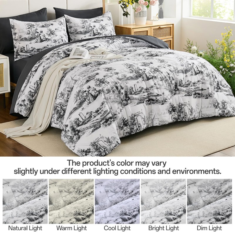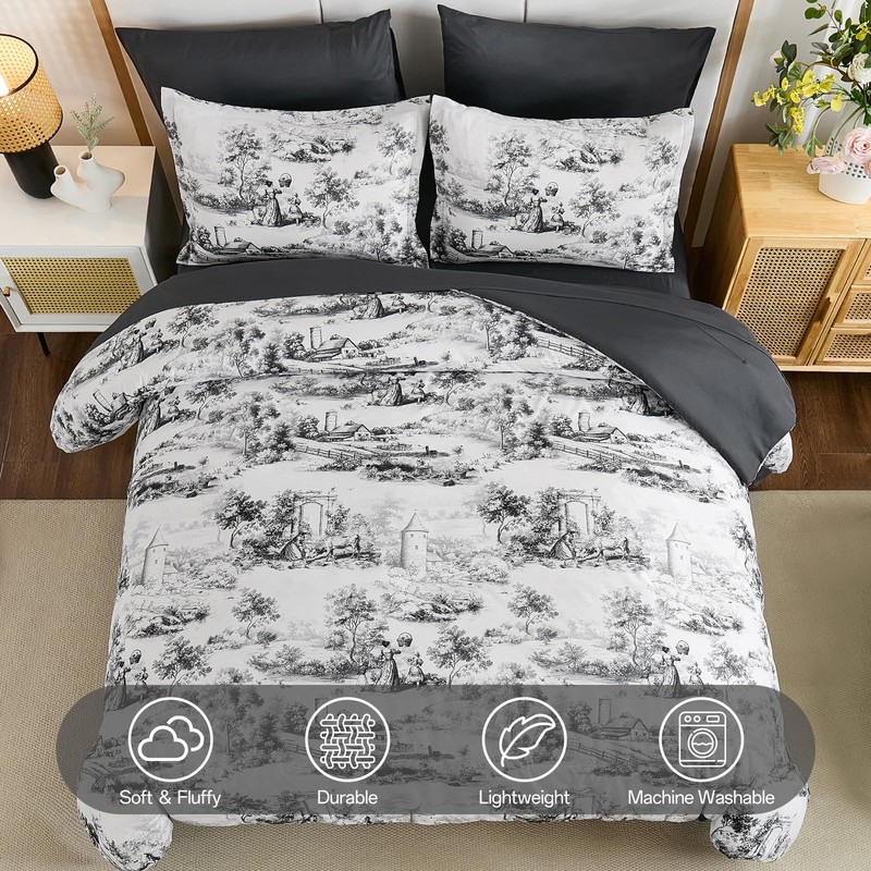 - [Toile de Jouy Comforter Design]: Elegant black and white toile de jouy showcases exquisite natural landscape patterns, crafting a soothing floral botanical ambiance for enhanced sleep and relaxation within these complete bedding sets.
