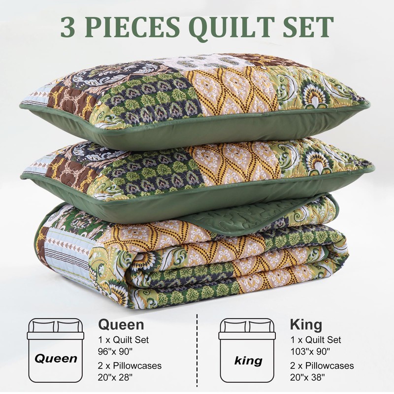 - PATCHWORK QUILT SET: Quen size quilt set include: 1 quilt 96"x90", 2 pillowcases 20"x28". The same patterned pillowcase design makes this bohemian damask paisley quilt bedding set more harmonious and stylish than ever!