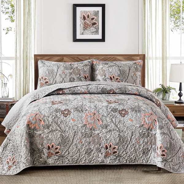 - BOTANICAL FLORAL QUILT SET: The bedspread king size bedding set featuring a beautiful flower pattern on pure gray. Combined with leaves and branches pattern gives this bedspread coverlet a elegant atmosphere.