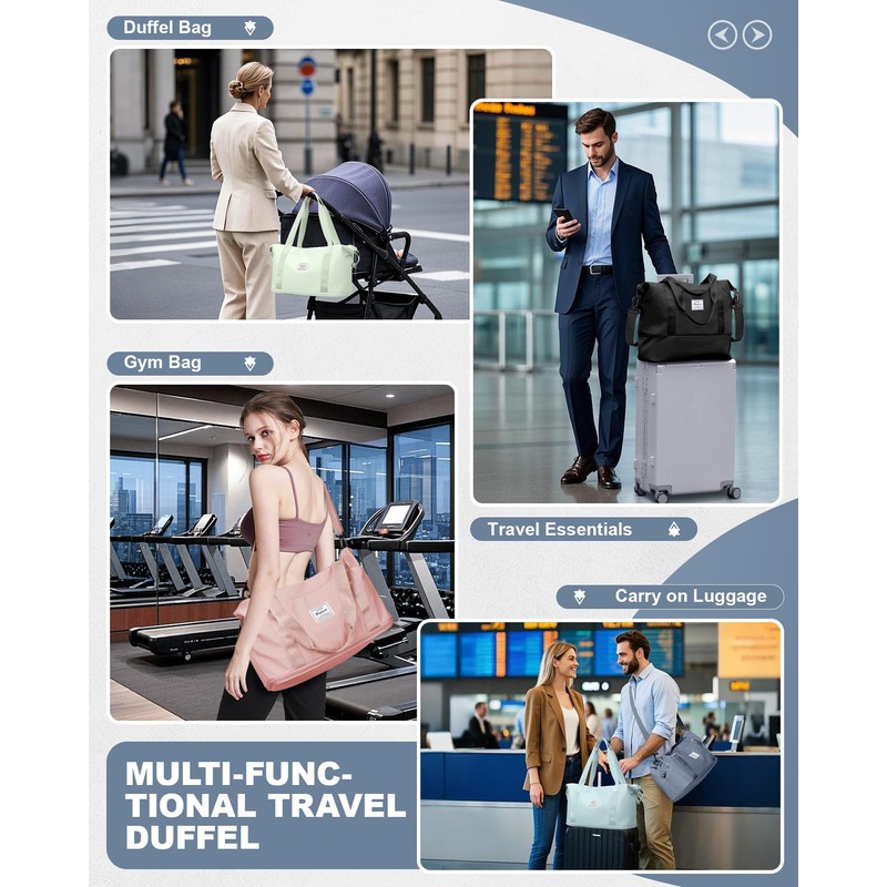 - High Capacity Travel BagTravel Bag has three multiple internal and four external organizational pockets,which ensure you placed more scientifically and orderly.The overnight bag for women has Large Capacity.Ordinary size :41*26*22CM,Expansion Dimension:41*37*22CM.You can carry it onto an airplane. Large storage space for a clothes for short trip.It has a capacity of 35L and can hold 6 to 8 pieces of summer clothes,Cosmetics,toiletries,wallets,keys,earphones,mobile power,mobile phones,files.