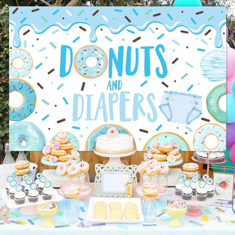 - Donuts and diapers: Our lovely donuts welcome baby party backdrop banner is featured with hundreds and thousands and donuts elements, printed with cute different teal donuts and blue diaper, which are popular among all ages and can make all your guests happy and satisfied. The large teal donuts & diapers backdrop banner will stand out from your baby shower party.