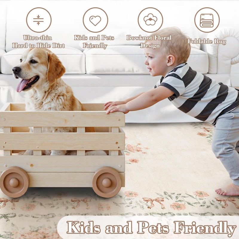 Wonnitar Floral BowKnot Print Machine Washable Area Rug, Ultra-Thin Rug for Living Room Bedroom, Soft Non Slip Rug for Nursery Girls Kids Room Classroom Playroom, Non Shedding Stain Resistant Low Pile Indoor Carpet