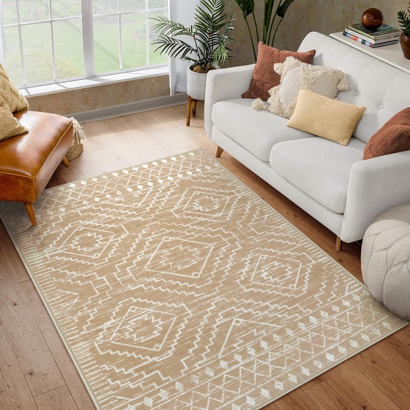 Wonnitar Moroccan Washable Area Rug 4x6, Non-Slip Rugs for Living Room, Boho Bedroom Throw Mat, Geometric Low Pile Floor Carpet for Home Office Mudroom Kitchen (Kakhi,4'x6')