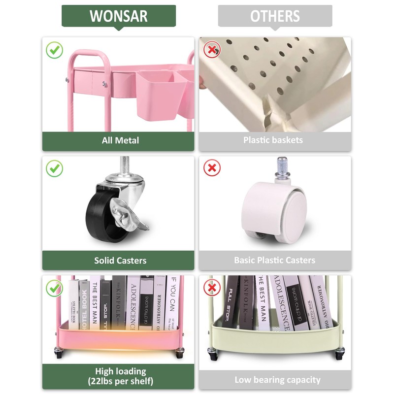 - 【Premium Construction】Both the basket and frame of this metal rolling cart are made of sturdy carbon steel, enabling super high loading(22LBS per shelf). Not easy to wear and tear. The bottom of each shelf adopts a mesh hollow design for better air circulation.