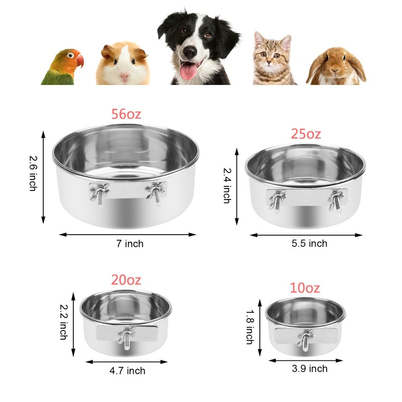 Wontee Pet Food Water Bowl with Clamp Holder Stainless Steel Feeding Cups Feeder for Dog Bird Parrot Cat Rabbit, 2 Packs (XL)