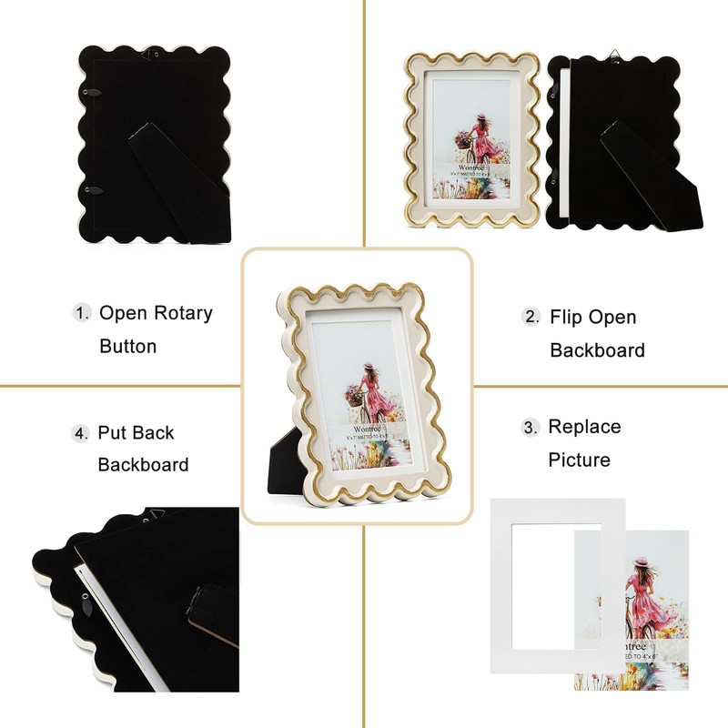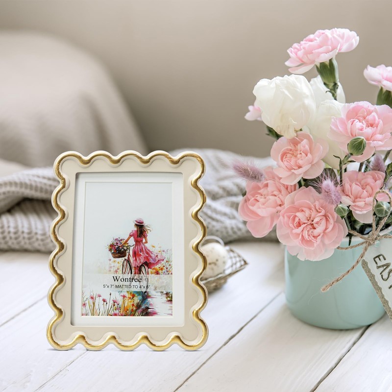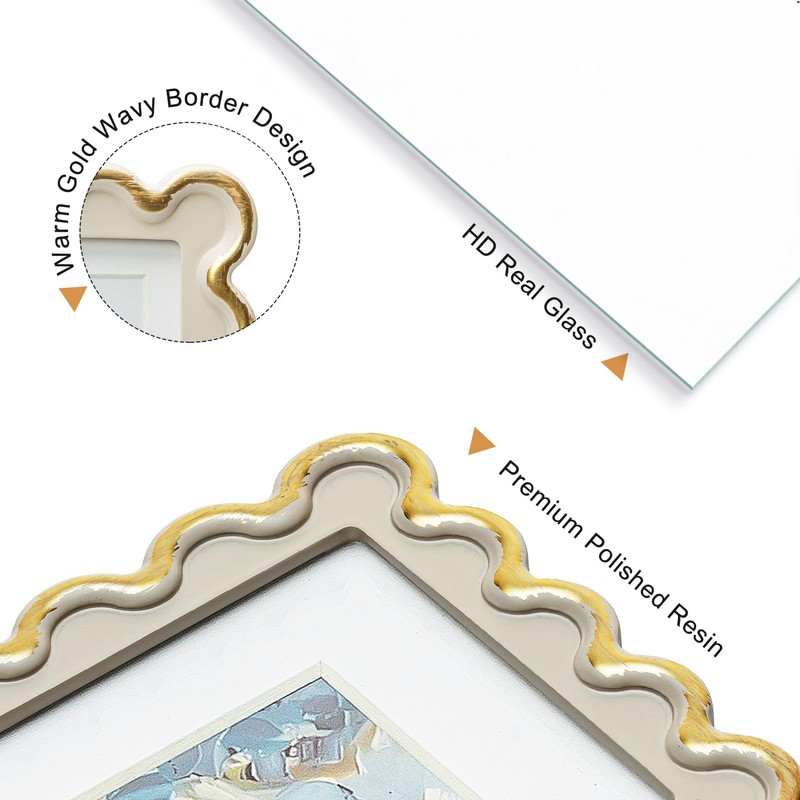 Wontree 5x7 Picture Frame in Beige with Elegant Brushed Gold Wave Accents, Resin Frame with Real Glass, Display 5x7 Photos Matted to 4x6, Vertical and Horizontal Desk Tabletop or Wall Hanging