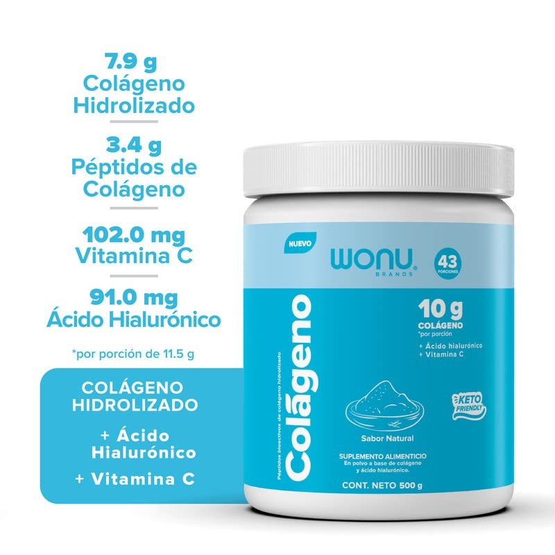 WONU, Colágeno Hidrolizado Presentación en polvo, 500 g, Péptidos de colágeno, Ácido hialurónico, Vitamina C, Sabor natural.