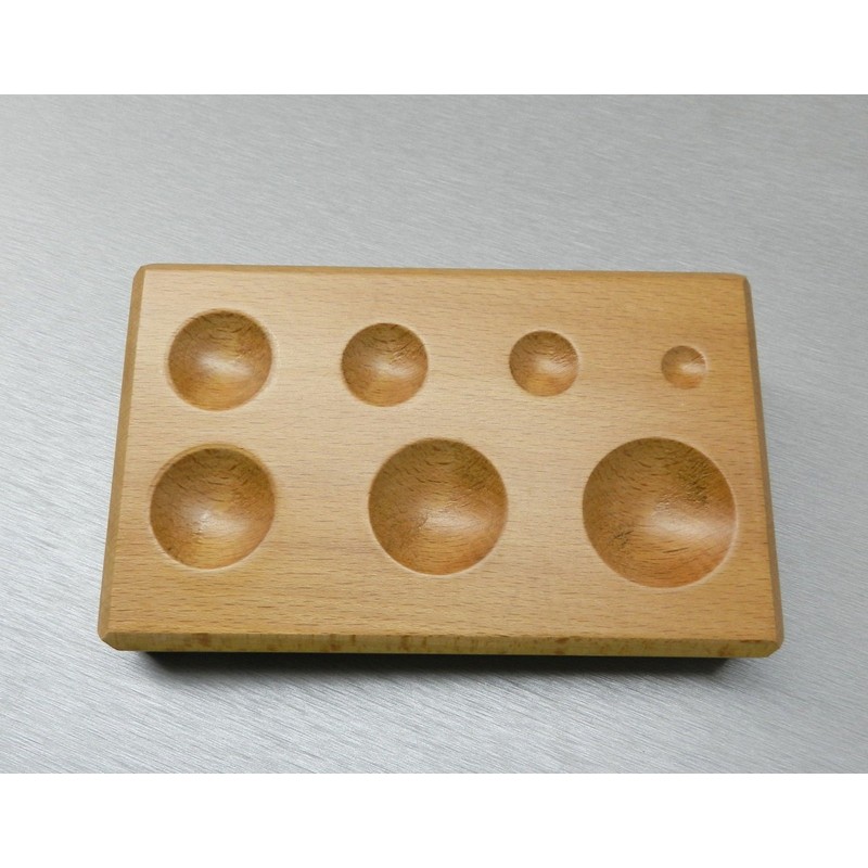 PRODUCT DESCRIPTION This finely finished dapping block is made from hardwood to prevent scratching or marring used in jewelry metal form designing and dapping. It has seven round shape depressions. Each block measures 6-1/4" x 4" x 1”. PRODUCT SPECIFICATIONS .- Material: Hard Wood .- Block Depressions: 7 .- Dimensions: 6-1/4" x 4" x 1" .- Shape of Dies: Round