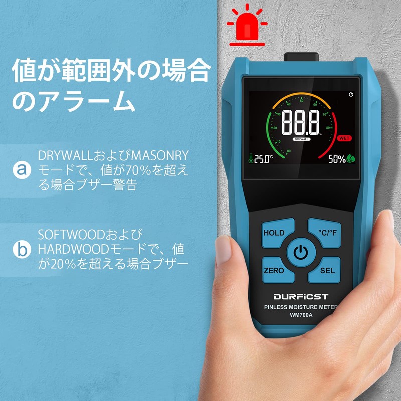 - Alarm: When an object measured with a wood hygrometer is out of range, the alarm will sound. Alarm when the wood hygrometer value exceeds 70% in DRYWALL mode and MASONRY mode, alarm when the value exceeds 20% in SOFTWOOD mode and HARDWOOD mode