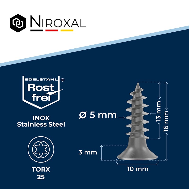 - The high-quality screw range from NietFullThings is constantly being expanded. We regularly improve our quality-tested 16 mm Torx stainless steel screws to always ensure excellent quality. High-quality, rustproof V2A stainless steel material ensures long-lasting industrial quality products. We are committed to sustainability and resource conservation.