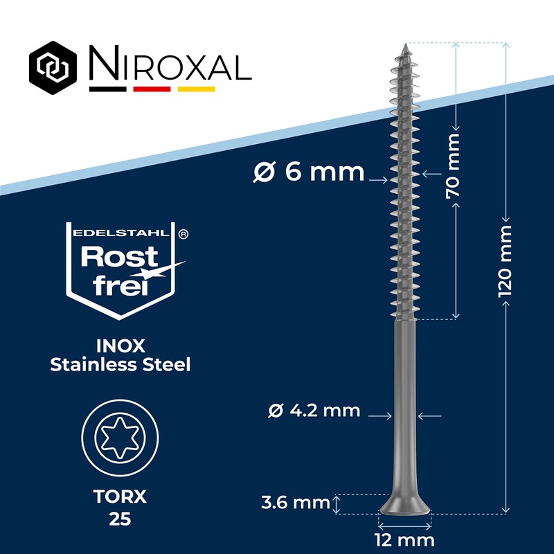 - Technical data: V2A Torx screws (see pictures): length (L) = 120 mm; head diameter (dk) = 12 mm; head height (k) = 3.6 mm; drive = TX25; thread length (b) = 70 mm; diameter (d) = 6 mm; drive shape = hexalobular socket; thread type = wood thread; head shape = 90° 90°Tensile strength = 50; material = stainless steel V2A AISI 304 A2; head = flat head = retractable