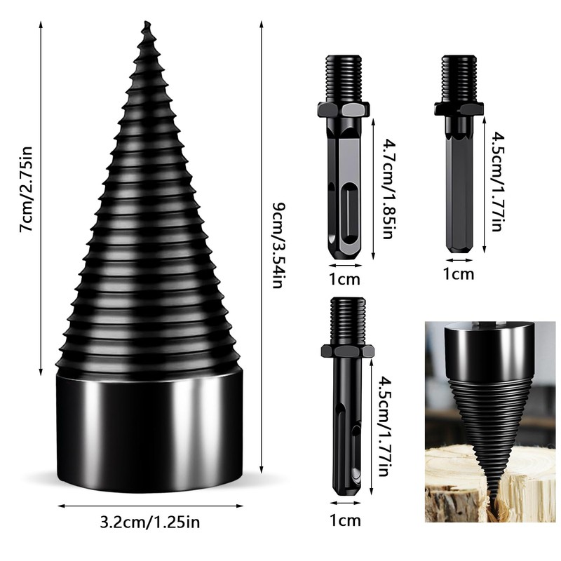 - Wood splitter material: our wood splitter drill bits are made of carbon steel. The quenching hardness at high temperatures is very strong. The wood splitting drill has super strength, impact resistance and abrasion resistance. The wood splitter screw cone has a long service life, a high hardness and a strong toughness.