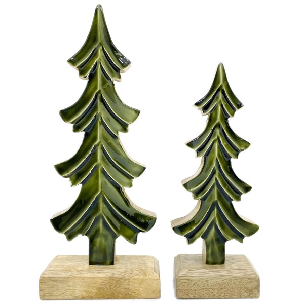 Wood Tree Decor - Set of 2 Green Glazed Wooden Holiday Winter Display