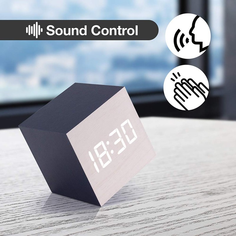 • MODERN DESIGN - Modern simplicity design with no buttons or plastic parts located on the front and four sides of the clock. LED light glows through the wooden finish for a clean modern look. Matches perfectly with any modern designed office or home furniture. Clock measures approx. 2.5 x 2.5 x 2.5 inches. Compact and portable. Great addition to any modern office or home furniture.