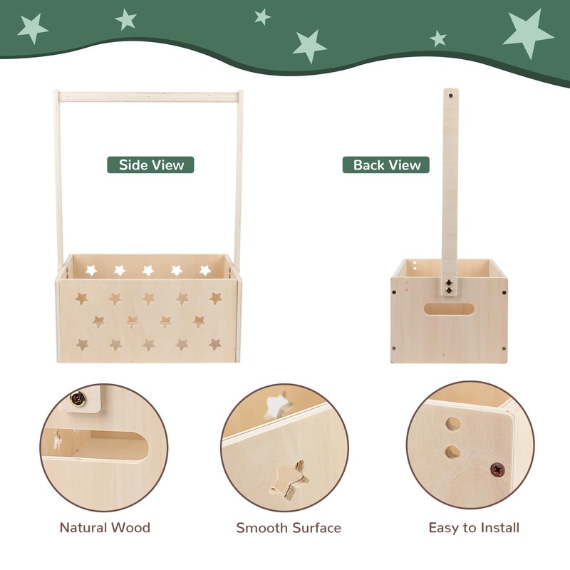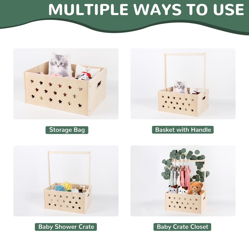 - Baby Shower Gift: This wooden baby shower crate closet set is contains 1 wooden crate with a handle, 1 eucalyptus garland and 5 baby clothes hangers. This welcome box would be a great gift for both boys and girls! Just place newborn's clothes, bottles, diapers, toys, etc. This baby crate hamper with handle offers dual functionality of storage and hanging. The handles are adjustable. Hanging rod can be installed at the back or in the middle.