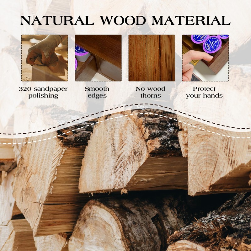 - Premium Natural Wood Construction--Made from high-quality natural wood with a beautiful grain, this sturdy coffee pod holder features gold stainless steel handles and traditional mortise and tenon joints. It can support up to 35 lbs, making it perfect as a k cup holder for counter or a base for your small coffee machine.