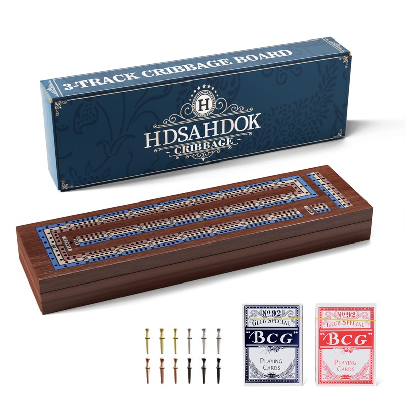 - UPGRADED DESIGN: This cribbage board set features a double-sided printed design with 3 tracks on the front and 4 tracks on the back, allowing multiple players and teams to play at the same time, and an embedded, high-quality magnetic closure to keep the accessories needed for the game.
