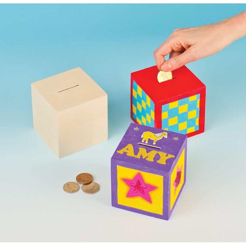 Wooden Cube Money Boxes 8.5cm with Removable Stopper for Children to Design & Decorate (Pack of 2)
