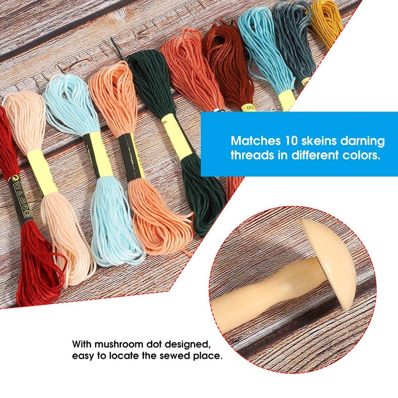Wooden Darning Supplies Kit with Mushroom Patching Tool and 10 Skeins Darning Threads for DIY Sewing Home Travel Handicraft