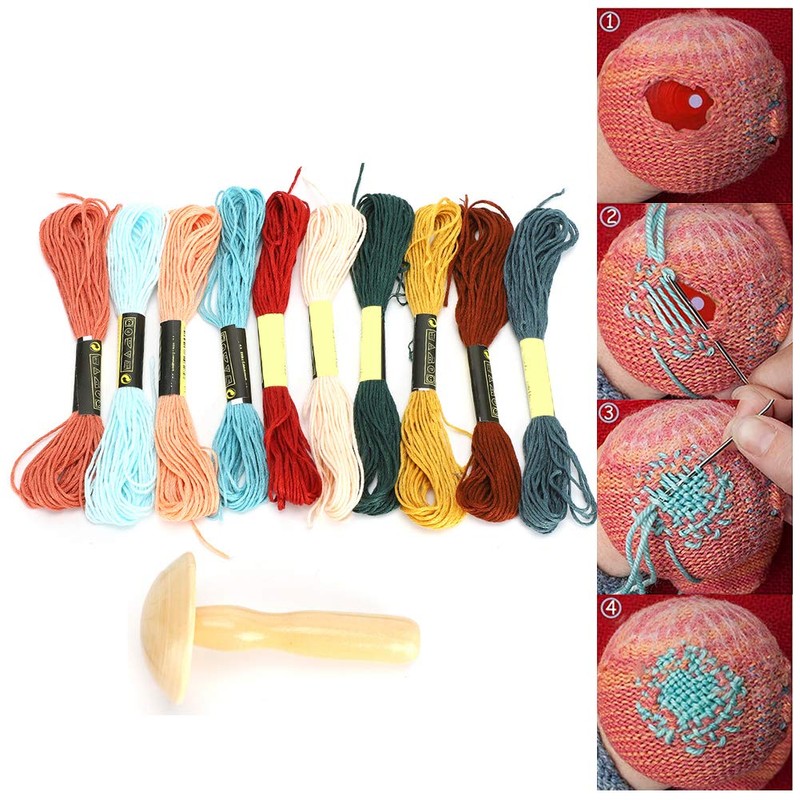 Wooden Darning Supplies Kit with Mushroom Patching Tool and 10 Skeins Darning Threads for DIY Sewing Home Travel Handicraft