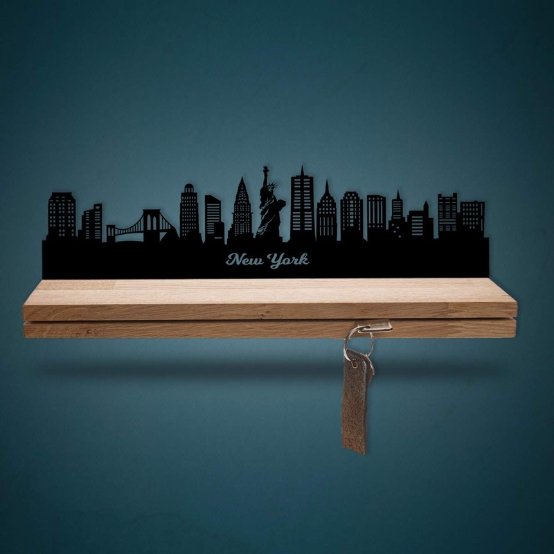 Wooden Key Rack with New York Skyline - Gift for City Lovers - Sturdy and Solid Oak Wood Key Holder - Modern Key Holder for the Wall - 100% Made in Germany - Size 25 cm