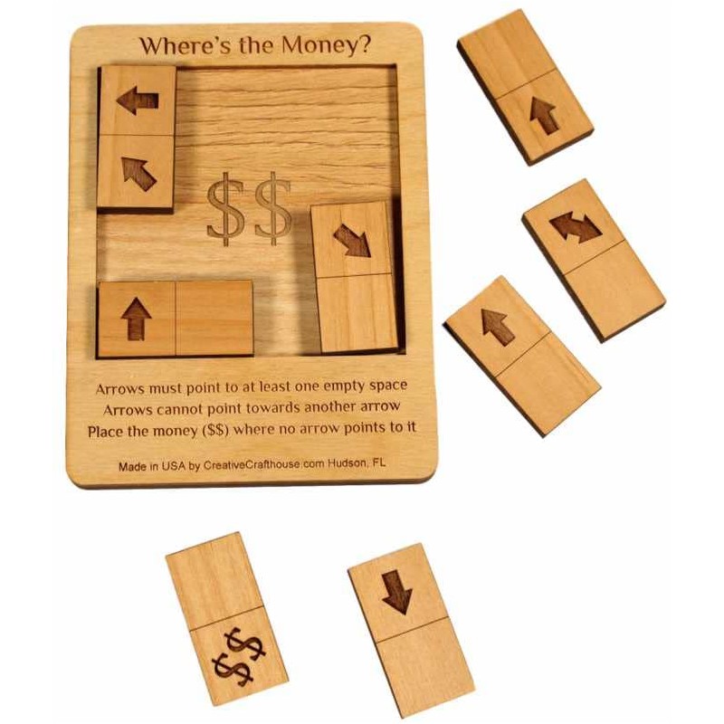 THIS PUZZLE WILL NOT HOLD MONEY OR ANY OBJECTS. A question older than the American dollar itself. Stuff the mattress, and don't let anyone find the money. All arrows must point to at least one empty space, cannot point to one another, and none may point at the dollar signs either. Made using a quality 4 3/8" x 5 6/8" birch plywood frame with a durable floorboard base. The pieces are finished 1/4" alder wood, laser etched and engraved to last forever. A fun coffee table or office piece that isn't as easy as it may first appear. Made in our Hudson, FL Shop. Based on a design concept by Alex Beresford at Dual Brain Games YouTube channel