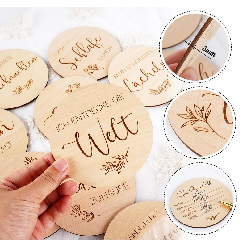 - Timeless design and craftsmanship: our 10 cm baby milestone month set features a simple, classic design that fits wonderfully with baby photos, whether you place your monthly milestone wooden discs next to your baby, combine with flowers and green or give them to your little one to hold and play during your shoot. With these smooth, baby-safe, paint-free monthly cards for babies, you have more options to choose from for your baby's photo shoot.