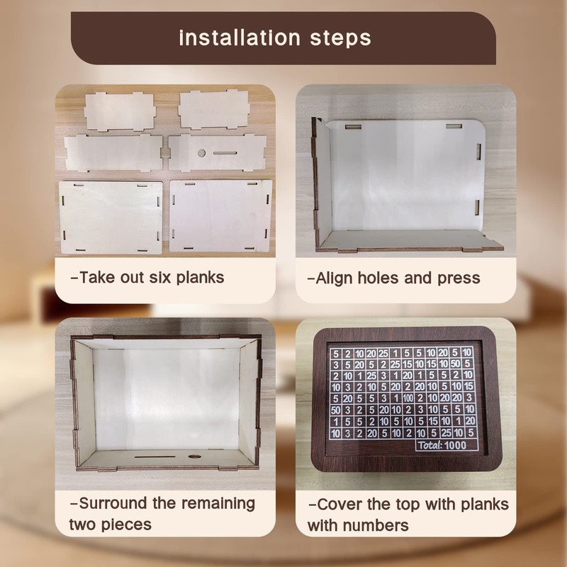 - Easy to assemble: saving box made of wood. The assembly is of course very simple, can be installed in a few minutes by simply splicing the appropriate holes and then using, saving has never been so easy and is even fun