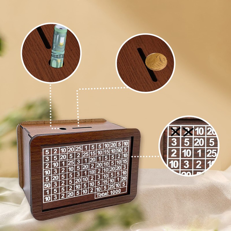 - Savings goal 1000: the surface of the money box is printed with different number amounts to achieve the goal of 1000, you need to deposit the amount printed on the box and tick the amount. Saving has never been so easy