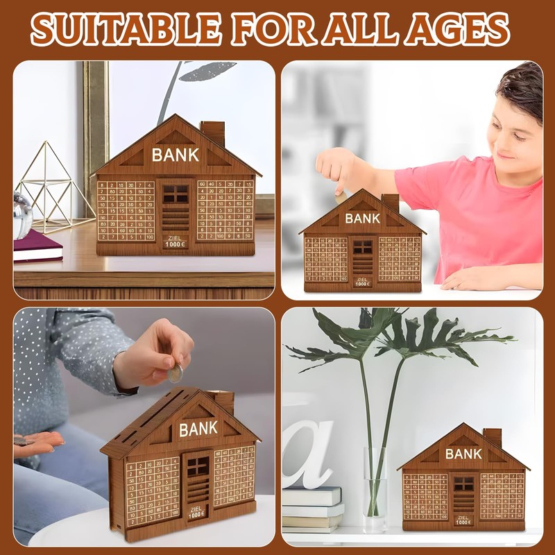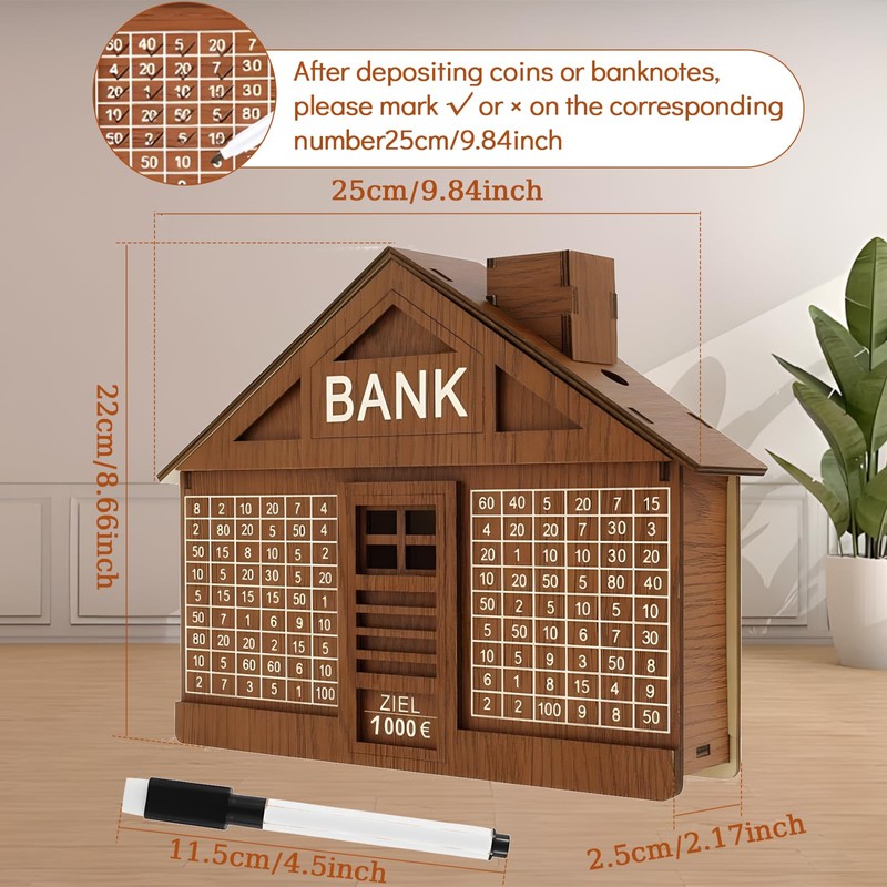 Wooden Money Box with Numbers, with Target, Money Box for Ticking, Money Box in House Shape, Suitable for Adults and Children (€2000)