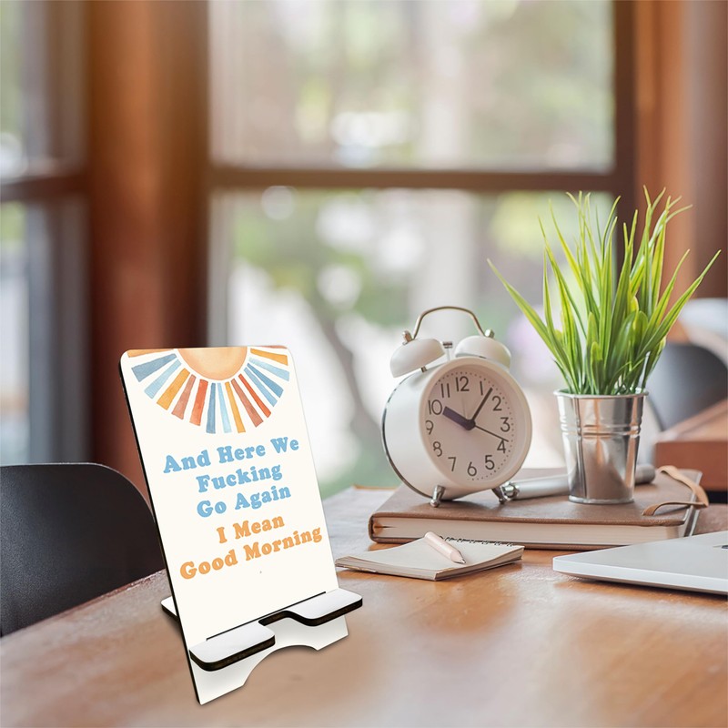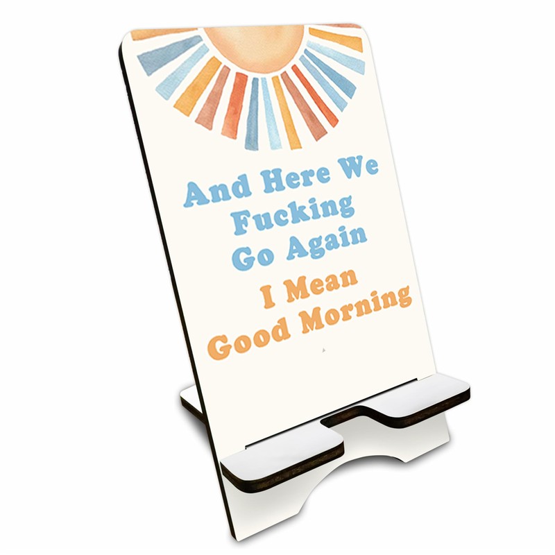 Wooden Phone Stand-and Here We Fucking Go Again I Mean Good Morning-Removable Smart Phone Holder,Suitable Phone E-Book & Tablets,Phone Accessories,Desktop Organizer,Home Decorations-A09