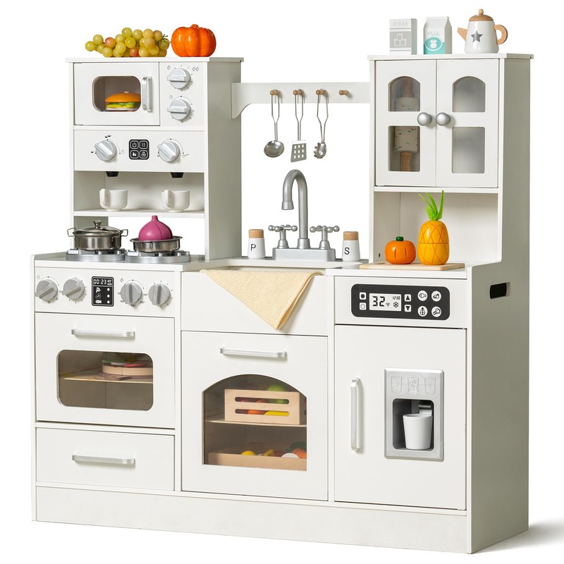 Wooden Play Kitchen for Toddlers and Kids with Lights & Sounds, Large Interactive Pretend Play Set with Ice Maker, Stove, Sink, Oven, 12 Accessories - Ages 3-8