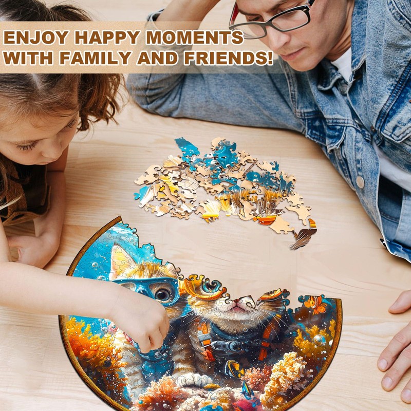 Wooden Puzzle Adults and Children, Diving Cats Circular Unique Puzzle, Wooden Puzzle Adults with Wooden Gift Box (M-200 Pieces)