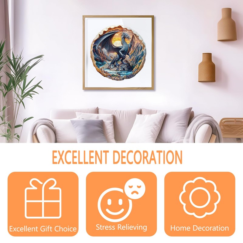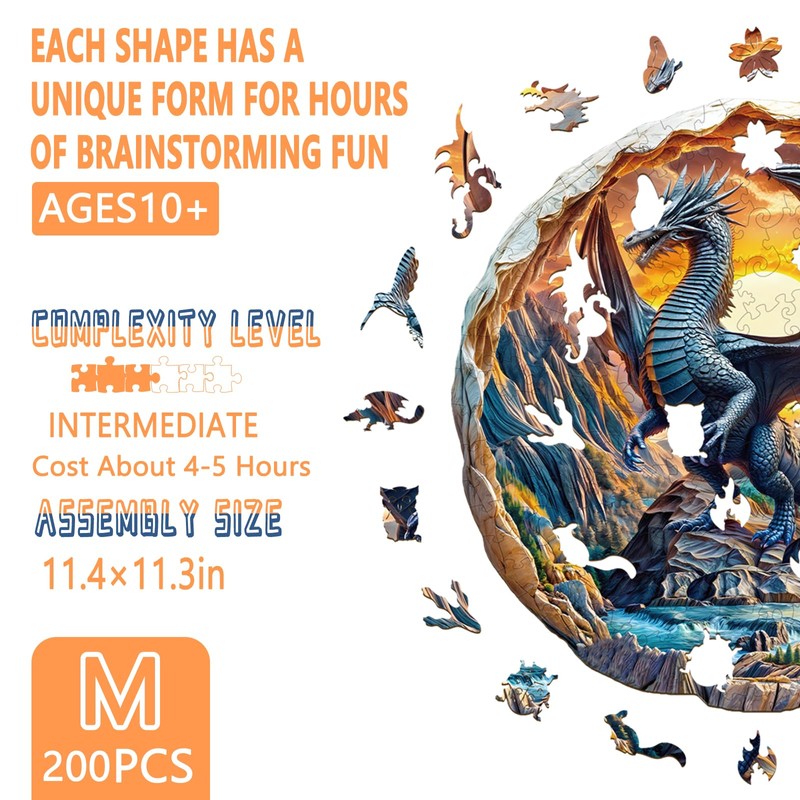 Wooden Puzzles for Adults, Flat Puzzle with 3D Visual Effect, Dragon in The Valley Wooden Jigsaw Puzzles for Adults 200 Pieces, Round Wood Puzzles Adult, Unique Animal Shape (M-11.4 * 11.3in)