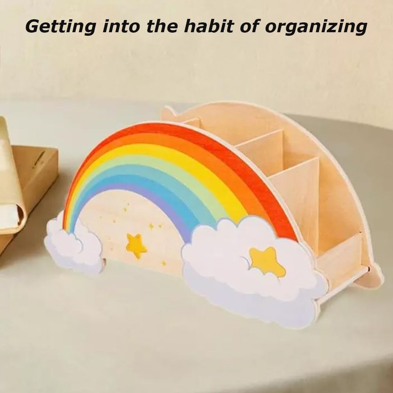 - [Cute Design and Functional]: Add some color to your art crafts space with an irresistible rainbow caddy! The caddy have 5 different size compartments to fit your desktop accessories