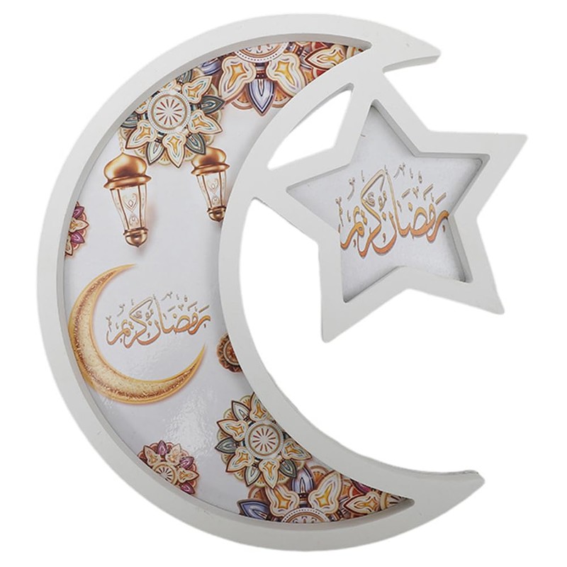 - Sophisticated Design: Beautifully crafted wooden lunar-shaped tray featuring intricate Islamic patterns and artistic elements, perfect for elevating your Eid celebrations and home decoration.