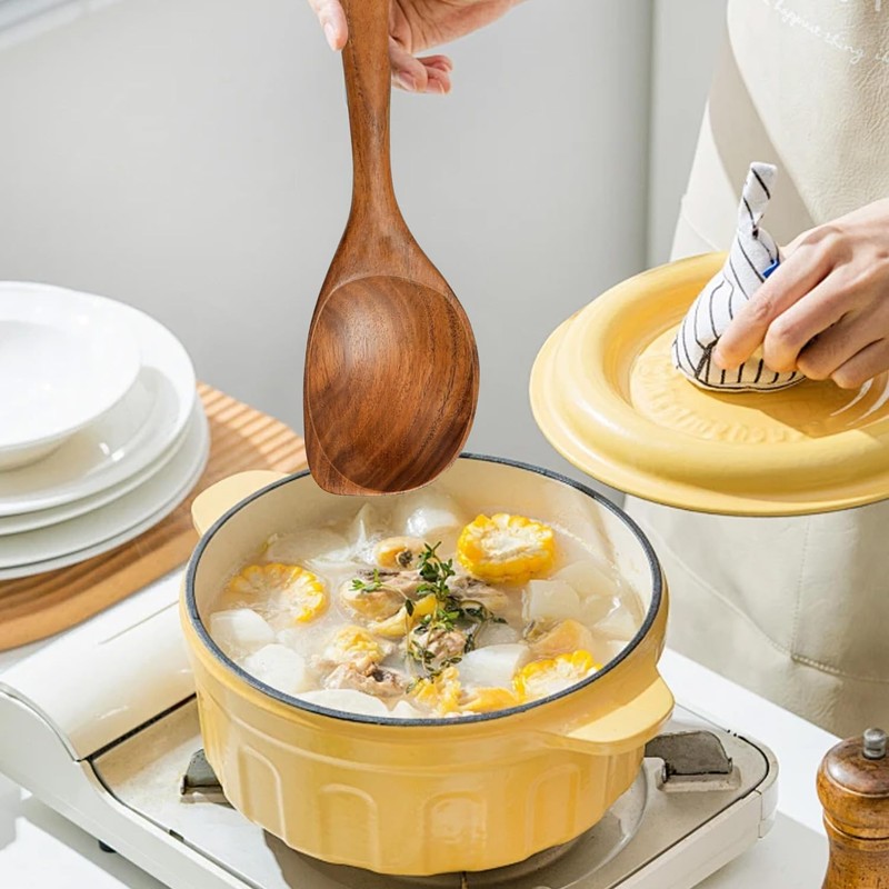 Worried that inferior kitchen utensils set will add weird flavors to your food and ruin it? We will provide a perfect solution for you! These wooden spoons are made of 100% natural solid teak wood and are safe for long-term use. Every product has a mellow and full texture which also conveys the temperature of life. It will help you simplify the cooking process while ensuring maximum fun! When you order our cooking spoons you can be confident that you will receive a natural product free from odor, sticky varnish, or flaky lacquer finish.