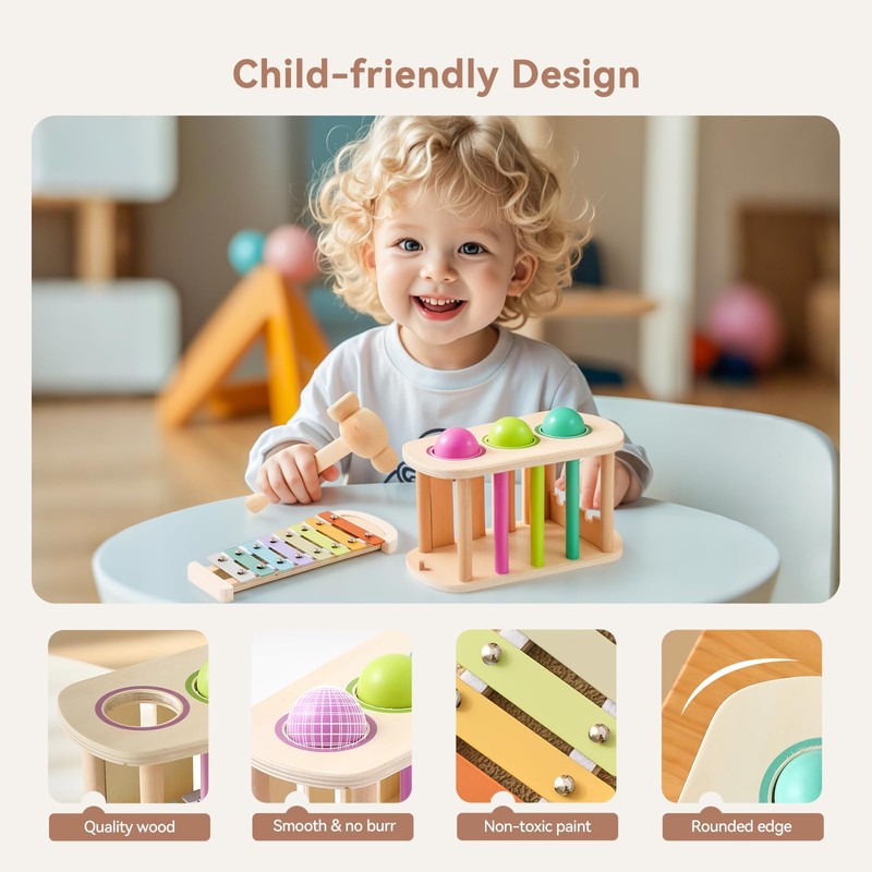 • 🎵 𝐖𝐨𝐨𝐝𝐞𝐧 𝐇𝐚𝐦𝐦𝐞𝐫 𝐁𝐚𝐥𝐥 𝐚𝐧𝐝 𝐗𝐲𝐥𝐨𝐩𝐡𝐨𝐧𝐞 𝐒𝐞𝐭: Combines hammering action with musical discovery - toddlers tap colorful balls that create delightful xylophone sounds, developing hand-eye coordination & sense of rhythm