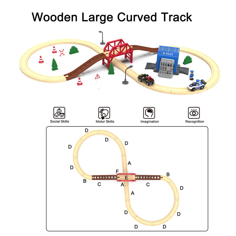 • 52pcs all-in-one wooden train set features double-side design tracks, including large curved tracks, bridge, ascending tracks, police station, active figures, magnetic train and other parts, aim to creating new themed and own unique railway system.