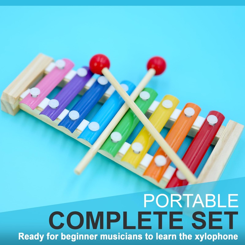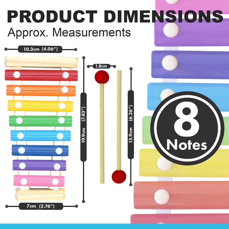 - 🥢🎼🔔🎵 INCLUDED IN THIS PACKAGE - You will receive one wooden xylophone with 8 coloured notes on them. Also you will receive two wooden mallets. The wooden xylophone measures approximately 19.9cm (7.83") in length and 10.3cm (4.06") in width. The wooden mallets measures 15.8cm (6.22") in length and 0.5cm (0.2") in width