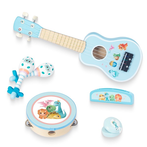 - 6-PIECE MUSICAL INSTRUMENT SET: Our toy set includes a beautifully crafted 1 x 17-inch ukulele, 1 x tambourine, 2 x maracas, 1 x clapper, and 1 x harmonica. Made from child-safe paint finishes and durable wooden materials, it's the perfect gift for boys and girls age 3 and under.