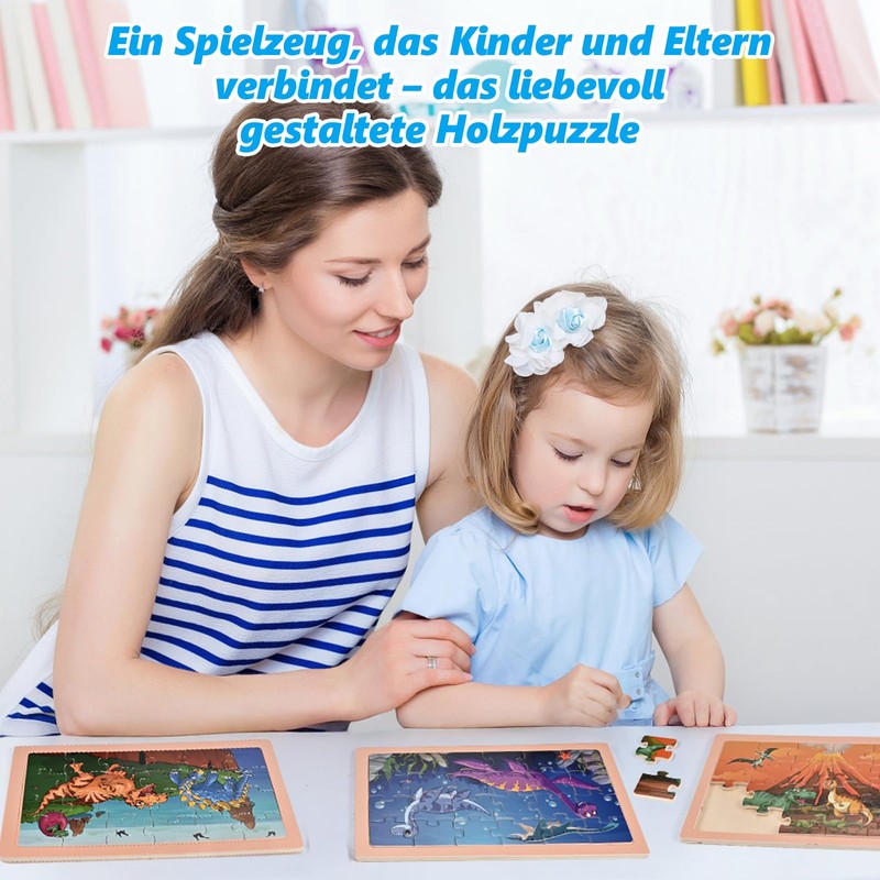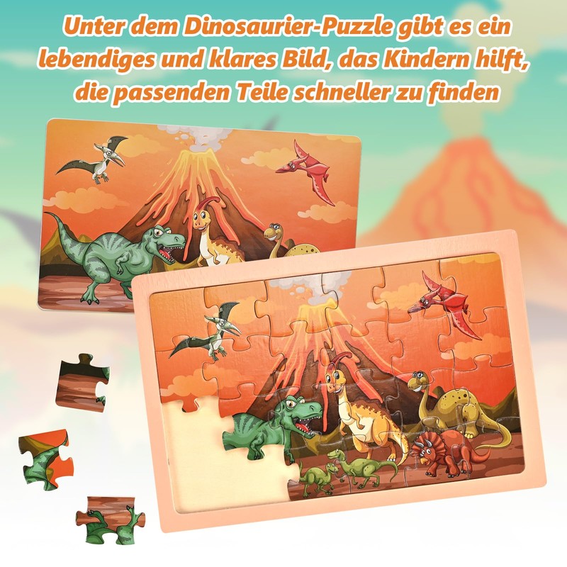 - ENTERTAINING DINOSAUR PUZZLES FOR KIDS This wooden dinosaur puzzle set includes 4 colorful puzzles, each consisting of 24 pieces. Once assembled, the puzzles can be seamlessly joined together and feature 4 fascinating themes: dinosaurs underwater, on the riverside, on cliffs and near a volcano.