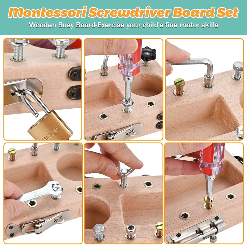 - 4.Montessori Tools for Toddlers: Our Montessori Screwdriver Board Set includes 7 styles with 14 inserted screws, 1 toddler busy board, a wrench, a lock with 2 keys, a dual-purpose screwdriver, and an L-shaped hex wrench. These Montessori wooden screwdriver toys help your child exercise hands-on skills, develop fine motor skills, and enhance observational abilities