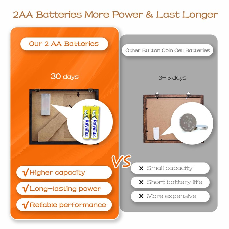 - 2 AA BATTERIES INCLUDED. This memorial frame comes with 2 AA batteries for use. More durable and long-lasting than other photo frames with coin cell batteries. Turn on the switch to light up the shadow box and turn it off when not needed. Easily replace the AA batteries when they run out of charge.