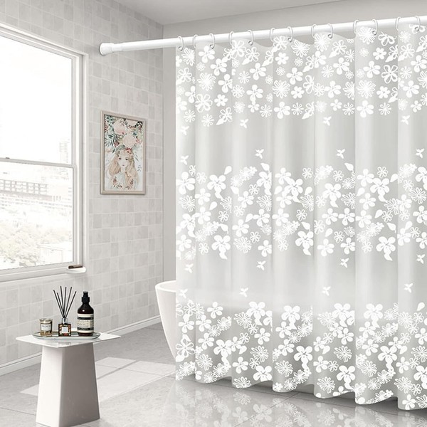 WOODFIB Shower Curtain, 100% PEVA Waterproof Anti-Mould Proof Resistant, Quick-Drying, Washable Bathroom Curtain, Includes 12 Pcs Curtain Hooks, 180 x 180 cm (White Flower)