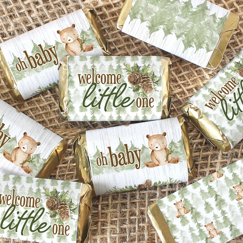 - 45 STICKERS: Oh baby and welcome little one candy bar wrapper stickers made to match gender neutral, rustic woodland baby shower decorations and supplies.