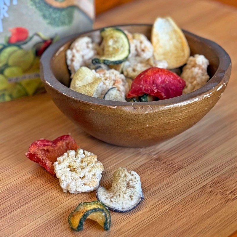 - VACUUM FRIED VEGGIES - Our Mediterranean spice seasoned eggplants, sweet peppers, zuccchinis, and onions are gently vaccum fried for a more delicatly, less oily crisp!