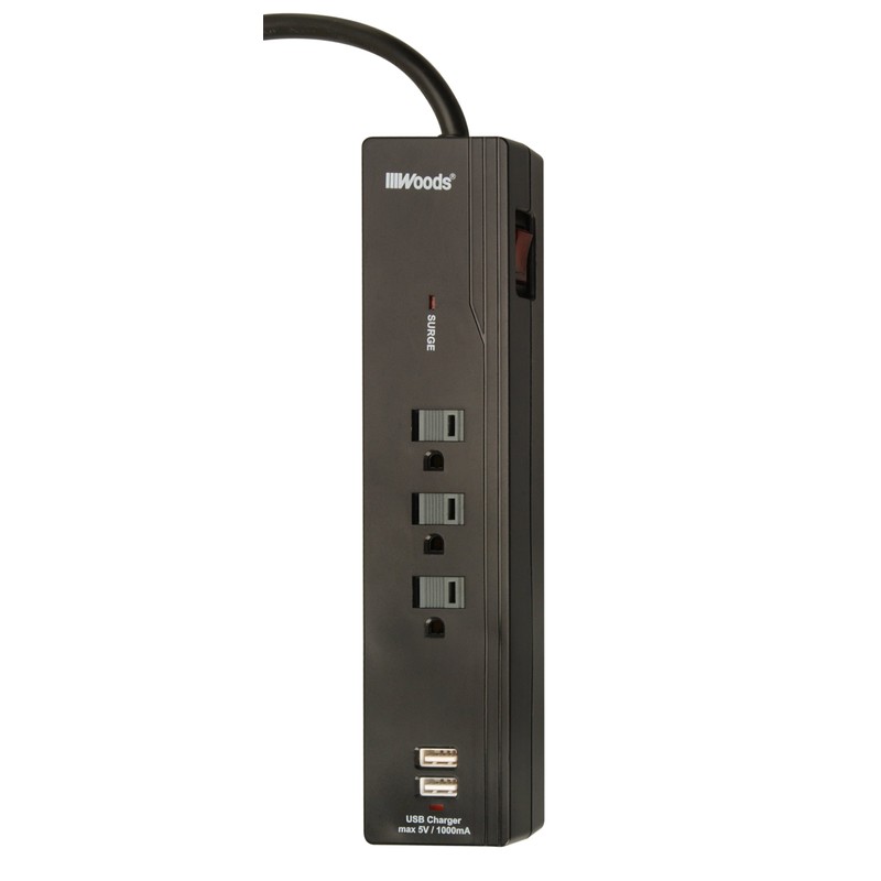 Woods 41250 3-Outlet USB Charger Combo Surge Protector (Black)